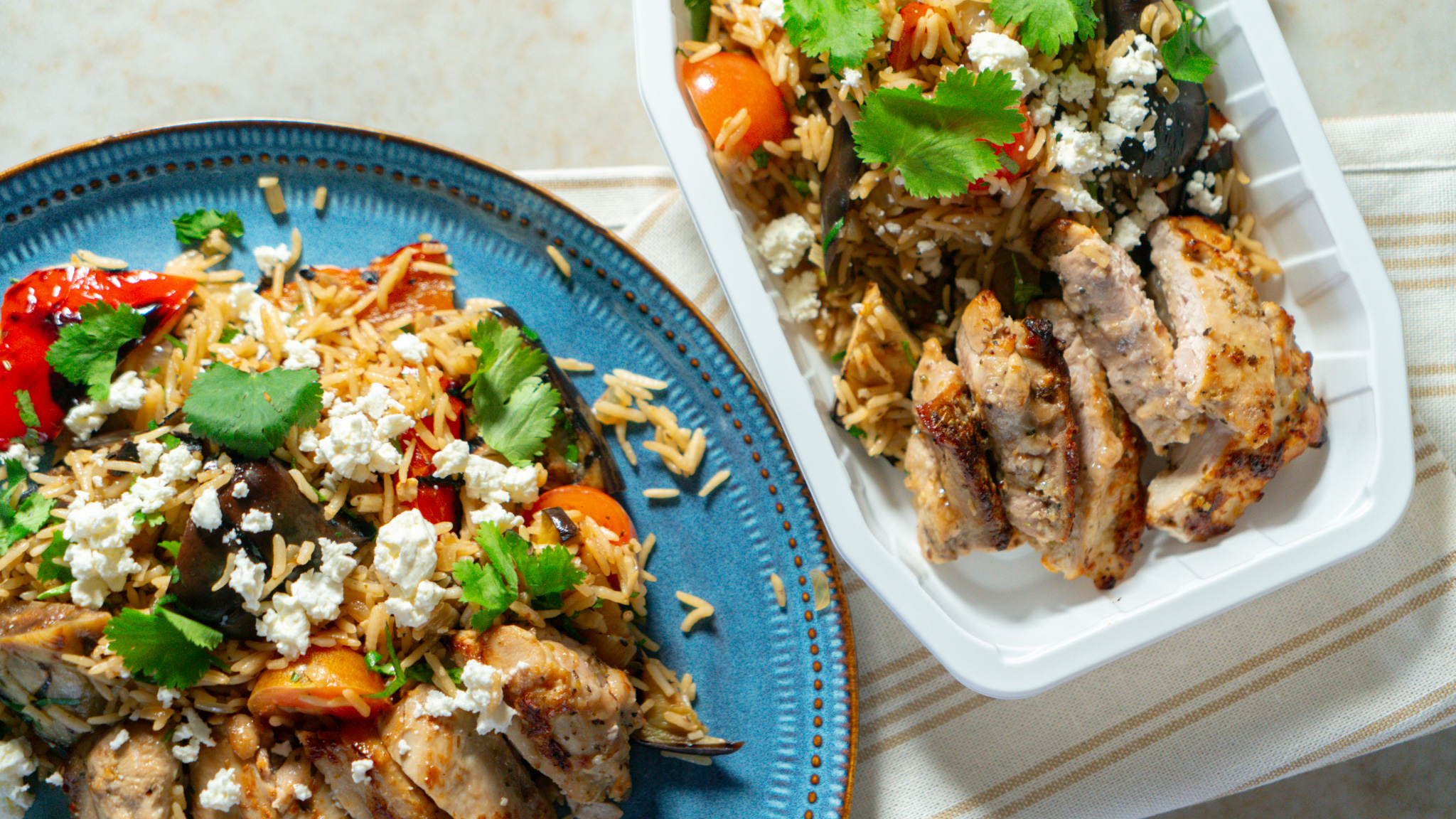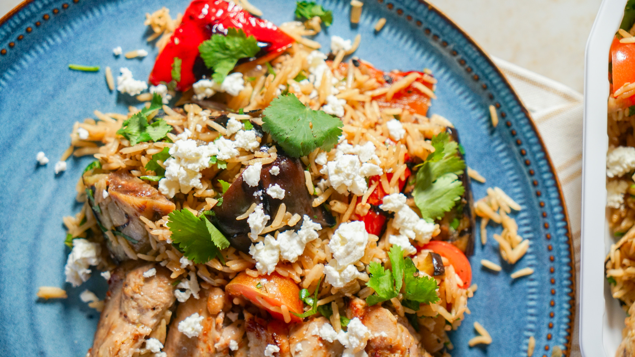 Free range chicken thigh, Basmati rice, Eggplant, Red capsicum, Red onion, Cherry tomato, Chicken stock (free range chicken bone, water, celery, carrot, onion, pepper), Feta cheese, Lemon, Extra virgin olive oil, oregano, Salt, Pepper.