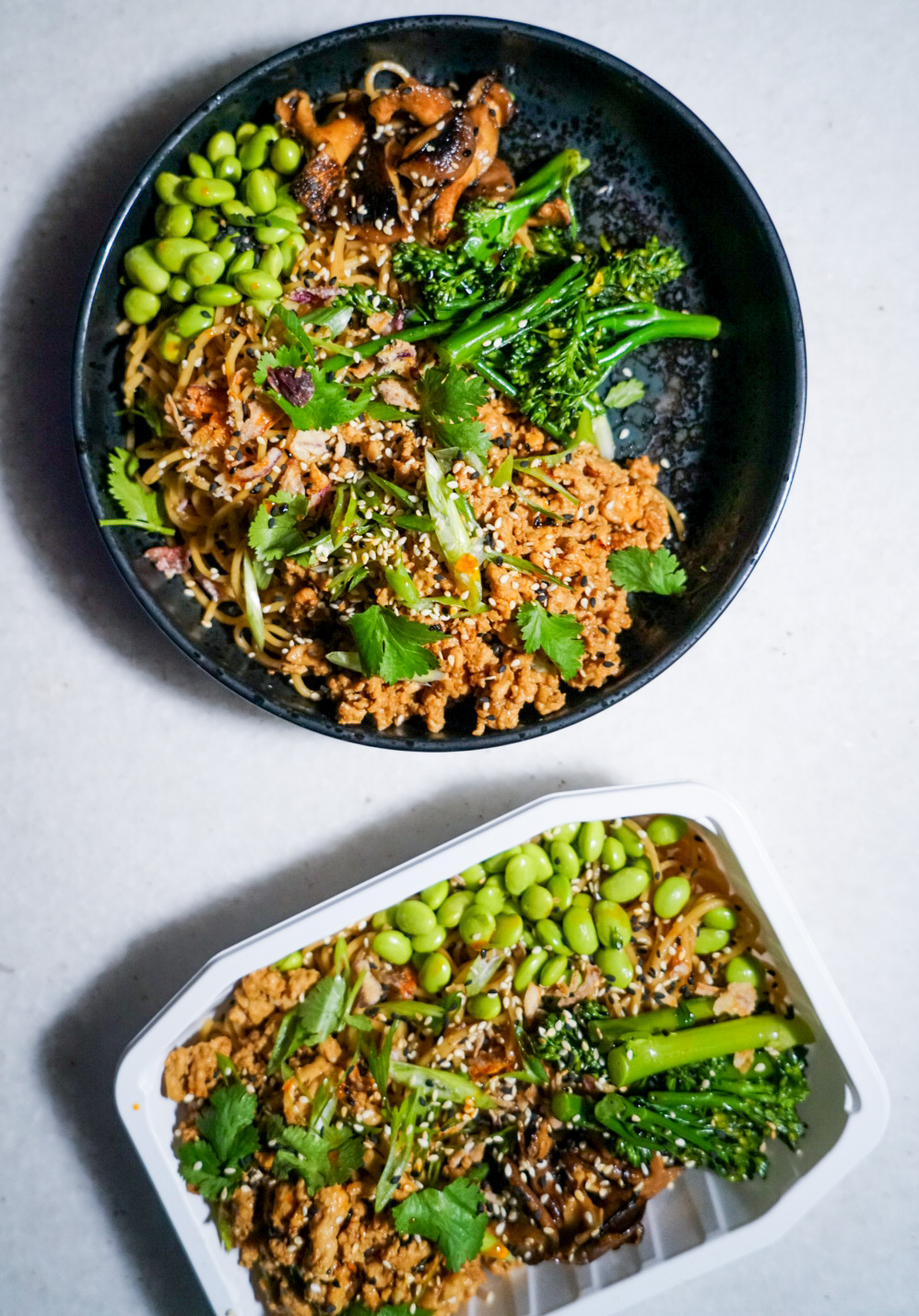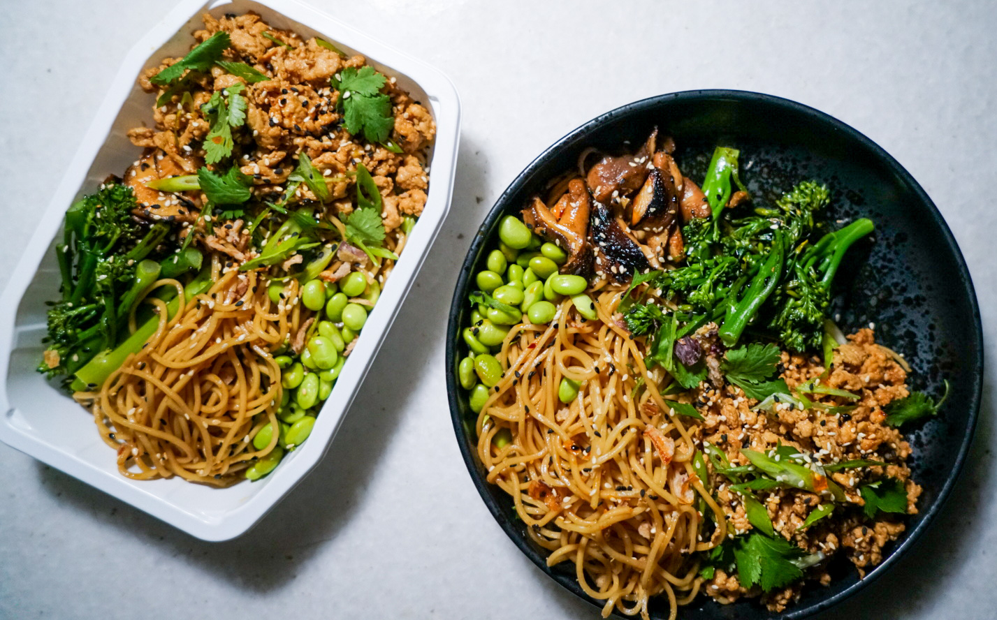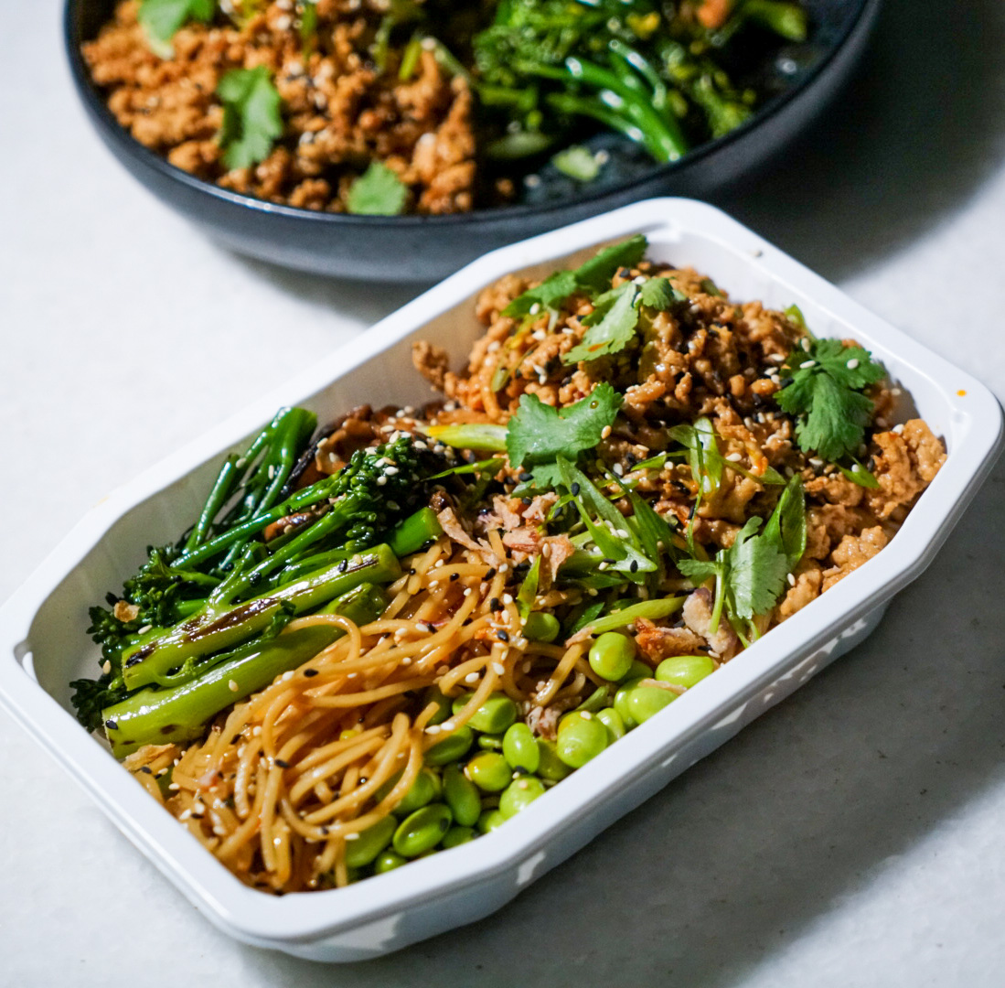 Free range Chicken, Organic ramen noodles (wheat flour, water, salt), Broccolini, Edamame, Shiitake mushrooms, kecap minus (Dark soy sauce), Soy sauce, Chilli, Shallots, Garlic, Spring onions, Sesame oil, Rice wine vinegar, Olive oil, sesame seeds, Salt, White pepper.