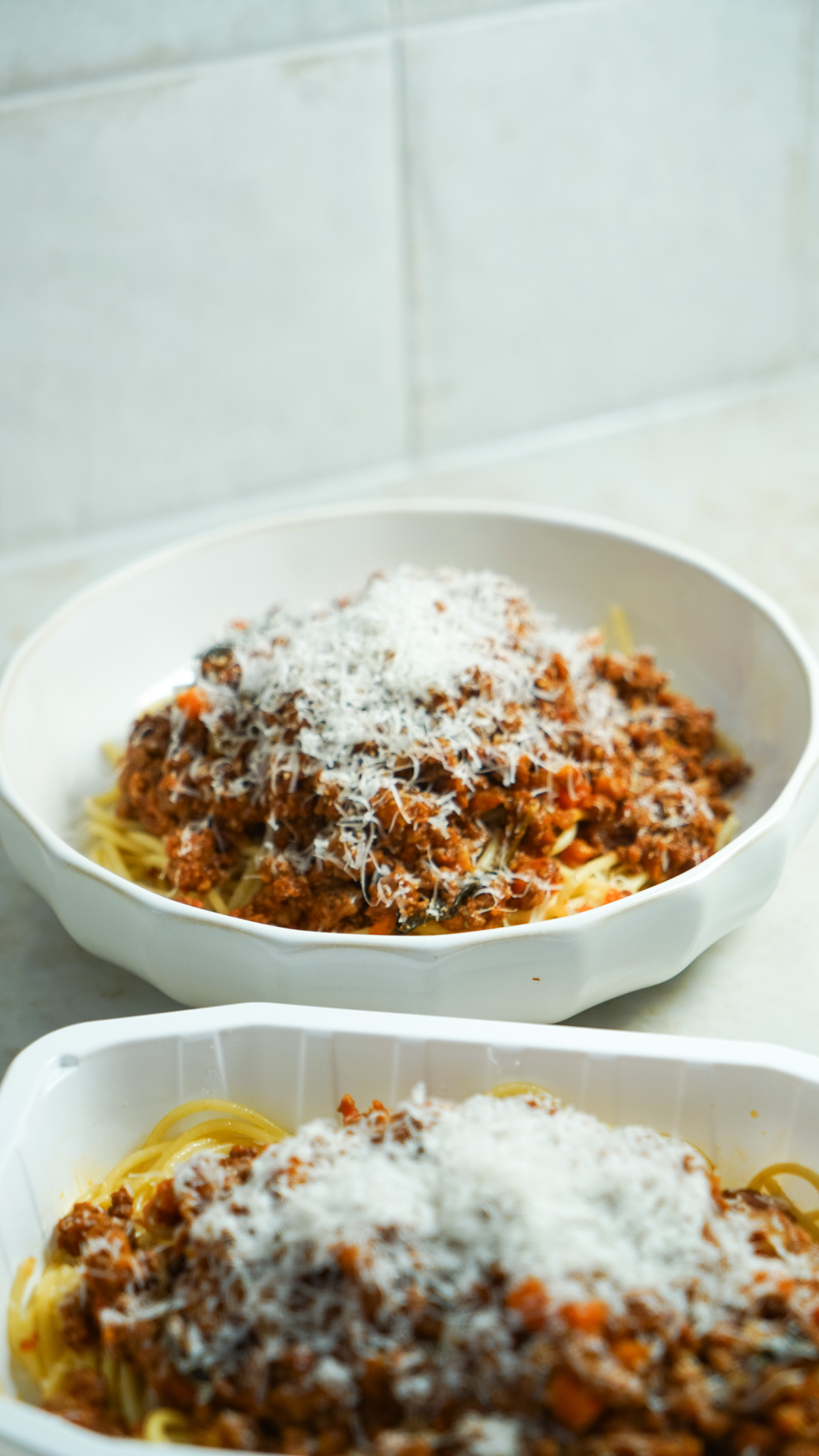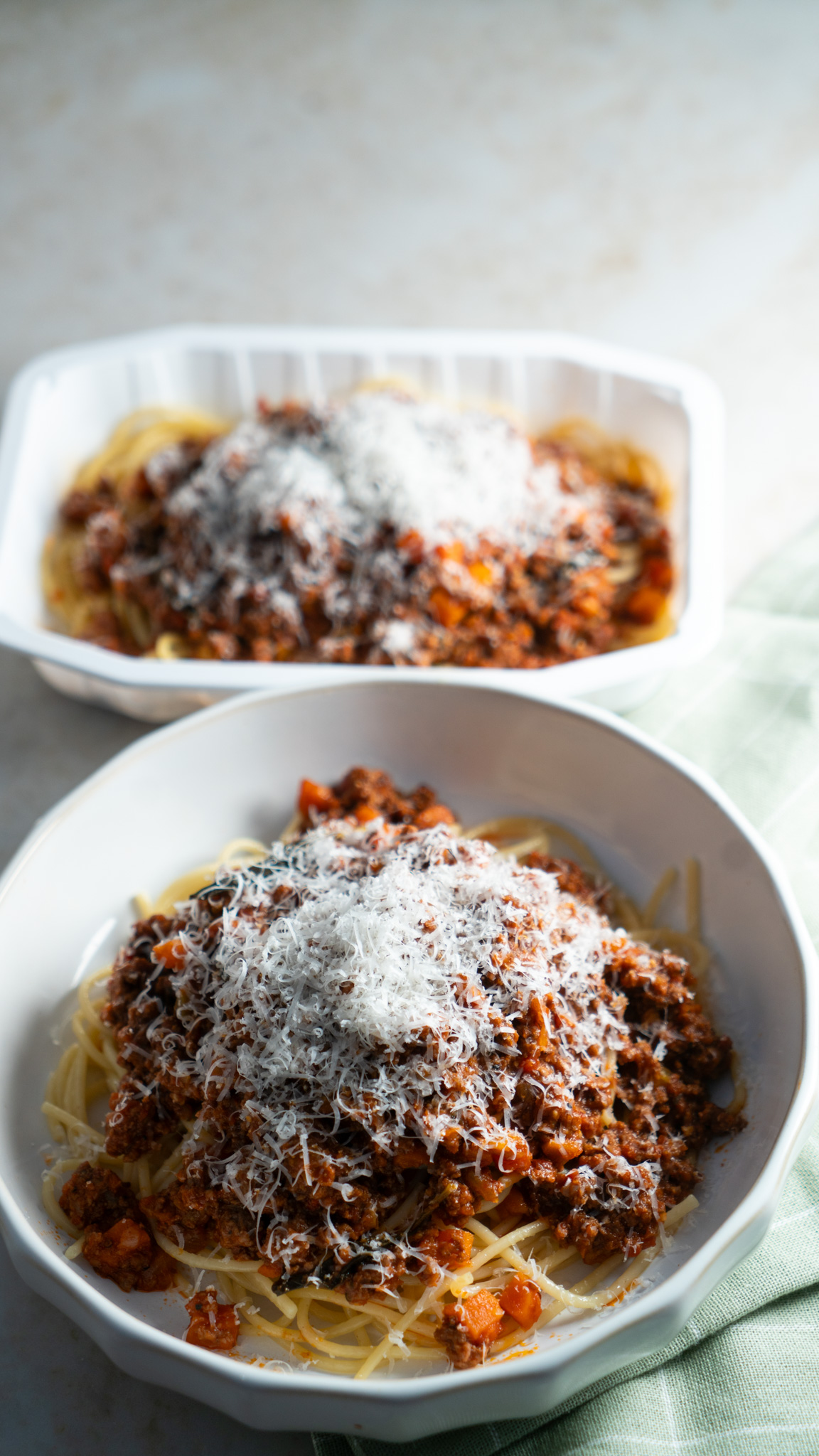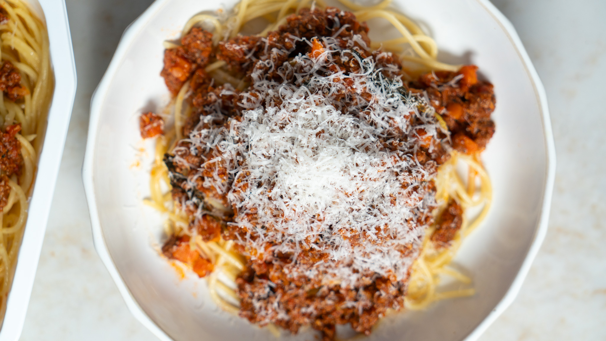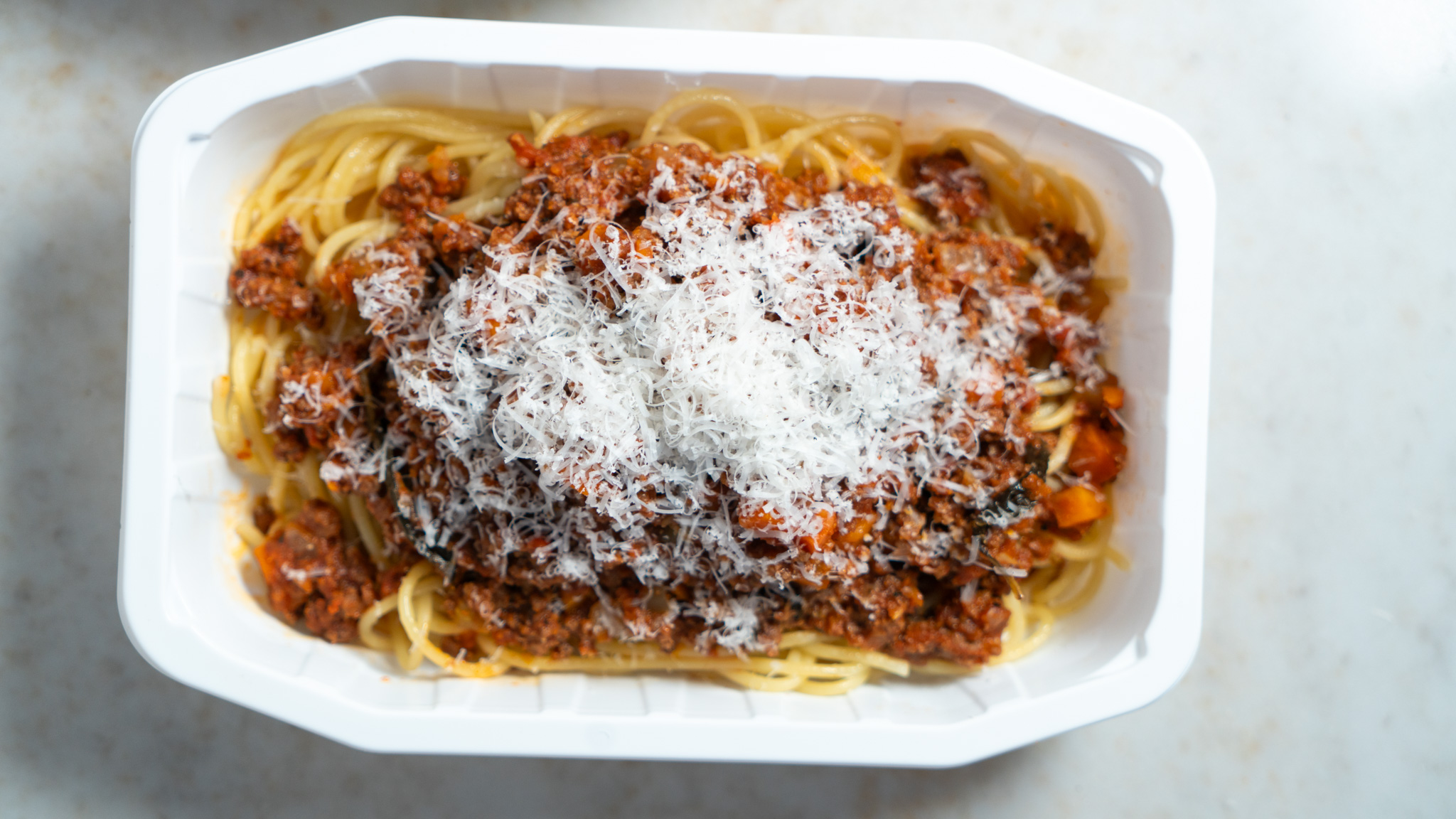 Grass fed beef mince, Spaghetti (durum wheat, semolina), Tinned tomatoes (Mutti), Chicken stock, Brown onion, Carrot, Celery, Garlic, Tomato paste (Mutti) Balsamic vinegar, Basil, Extra virgin olive oil, Parmesan, Mixed Italian herbs (oregano, parsley, thyme, chilli, rosemary, basil), Salt, Pepper,
